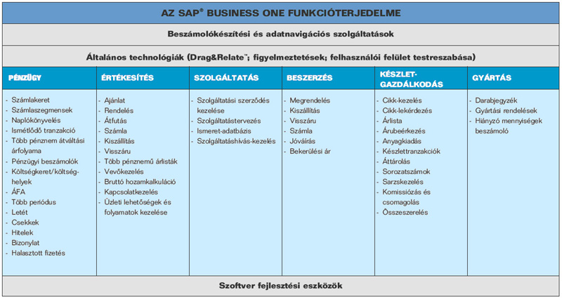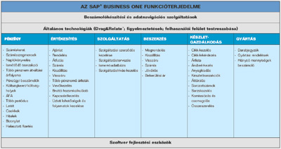 ![]() Jellemzők és funkciók Az SAP Business One segítségével a vezetők és a dolgozók hatékonyabban elérhetik és felhasználhatják az információkat - így megalapozottabb döntéseket hozhatnak. Az átfogó megoldás a sikeres üzleti működés valamennyi lényeges folyamatát lefedi: Üzleti ügyvitel: Pénzügy, Banki műveletek, Értékesítés és Beszerzés Ügyfélkapcsolat-kezelés (CRM): Értékesítési lehetőségek kezelése, Üzleti partnerek kezelése, Szervizkezelés Gyártás: Raktárgazdálkodás, Jelentéskészítés Bővebb információért kérem tekintse meg tájékoztatónkat. Funkcióterjedelem Az SAP Business One funkcionalitása tökéletesen modellezi egy tipikus KKV (kis- és középvállalkozás) vállalati folyamatait akár a kereskedelmi, akár az ipari, akár a szolgáltató ágazatban. A rendszermodulokról készült ábrát itt tekintheti meg: Az SAP Business One funkcióterjedelme (Kattintson a képre!) Bővebb információért kérem tekintse meg tájékoztatónkat. ÚJDONSÁG! Megjelent az SAP Business One Starter Package! Igen kedvezeő árú, csökkentett, de mégis bő funkcionalitást nyújtó megoldáscsomag maximum 5 felhasználóig mikro- és kisvállalkozásoknak. Bővebb információért kérem tekintse meg tájékoztatónkat. Áttekintő, összehasonlító táblázatot, a teljes funkcionalitású rendszerhez képest itt talál. |